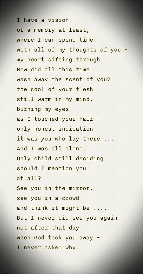 I remember my brother’s laugh. I remember jumping off the barn roof, out of trees into the creek, dancing on our toy box singing to dad’s old 45s, cuddling in blankets on the couch on a cold winter morning, kissing him in front of his friends to his embarrassment, fighting and making up, jumping on his back, wanting to be him, making him carry my school books on our walk from the bus stop, being jealous of his fearlessness and happiness, seeing mom rub his back and see him kiss her mouth long past the age where most boys would … I remember his hands and legs, so much like that of my own son … Yes, I’m really going there aren’t I? I’m ripping that scab off and letting the blood flow. It fills that wound even as my tears wash it away. It feels good to feel the pain. It feels good to remember, like taking a deep breath.