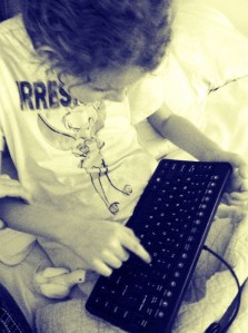 Me: Ok Emma you have to sit up like this” I correct my own posture. “C’mon let’s concentrate, okay? You can do this.” She models me for a moment, arching her back and leaning forward. My hand rests on her shoulder giving her a little pressure or sometimes her elbow, giving her hand light or hard squeezes in between letters as if to “reset” it. She might type out one letter and just get up and float around the room. It really all depends on how she is in the moment. And I know this may all seem so scattered and inconsistent, but hey…