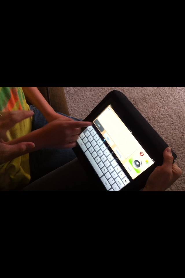 I held up the ipad. We are still using her Assistive Chat app with word prediction. I placed my hand on her forearm and she reached up to hit the “y” and then the word above.